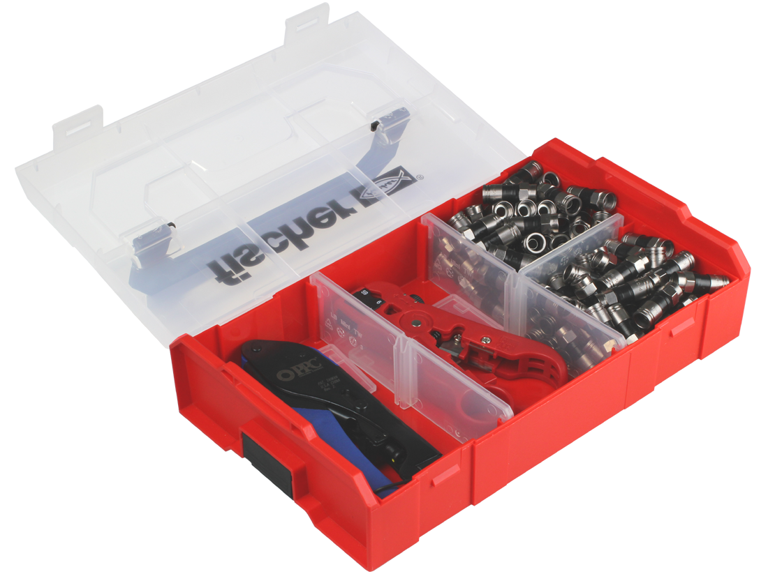 Complete compression connector assembly kit – includes coax stripper, compression tool, 100 F-connectors, and durable toolbox.