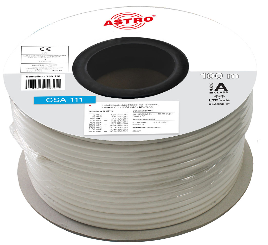 Triple-shielded coaxial cable, 100 m ring, 1.13 mm copper core, Class A+, Eca rated.