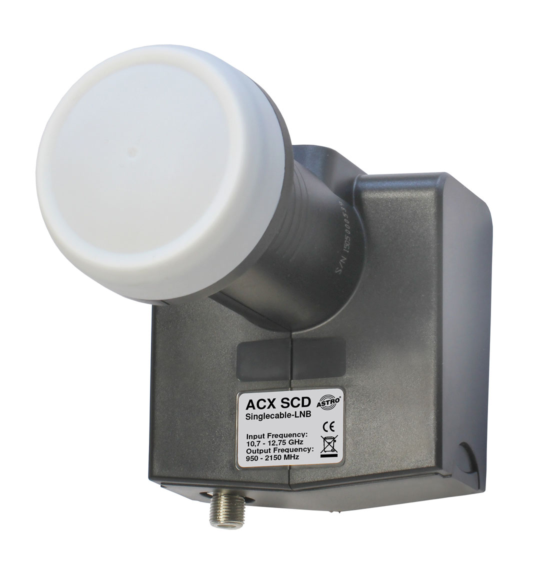 Unicable LNB for up to 24 users, programmable via ACX Programmer, weatherproof, and multifeed-ready.