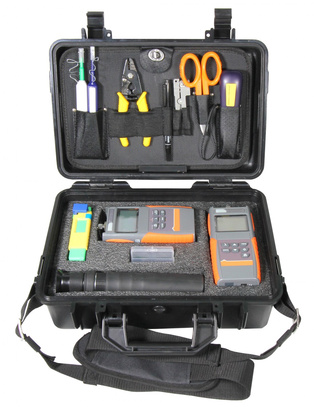 Glasfaser-Servicekoffer für Reinigung, Inspektion und Tests; mit Leistungsmesser, Laserquelle, Mikroskop, Adaptern und Werkzeugen im stabilen Koffer.