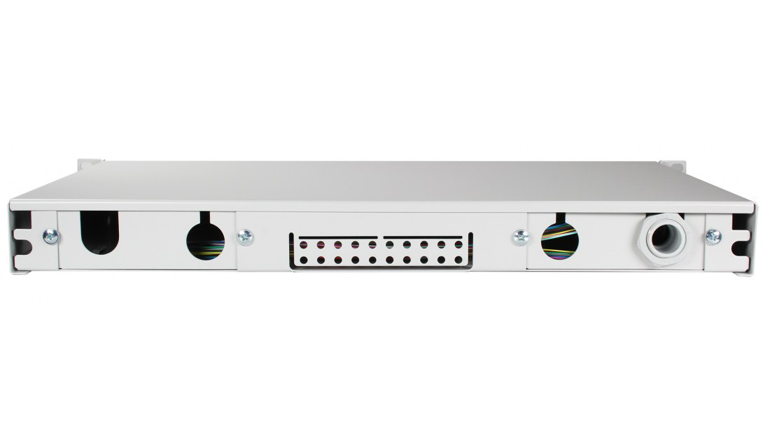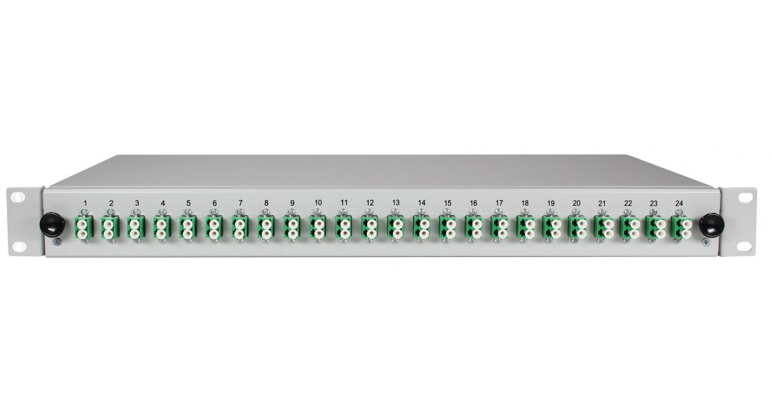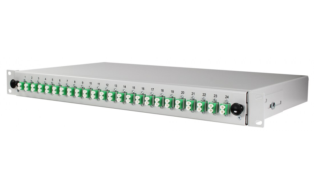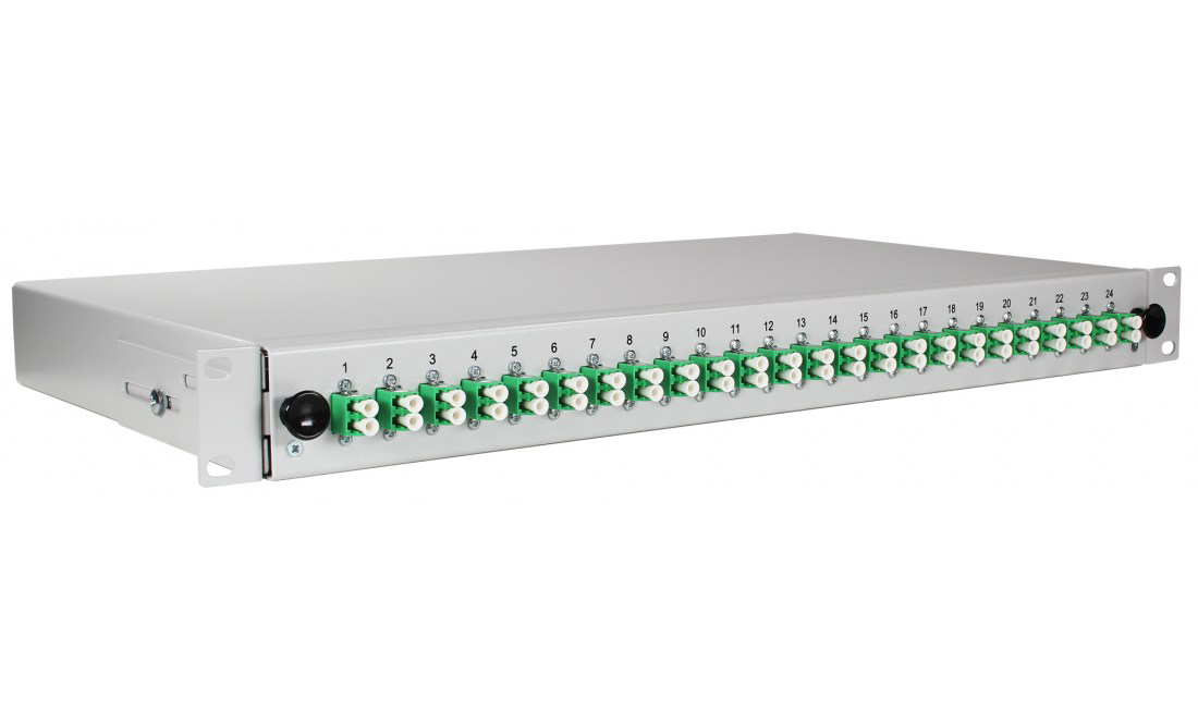 1HE Spleißbox, komplett bestückt mit 24× LC/APC-Duplexkupplungen, 48× Pigtails, 4 Spleißkassetten.